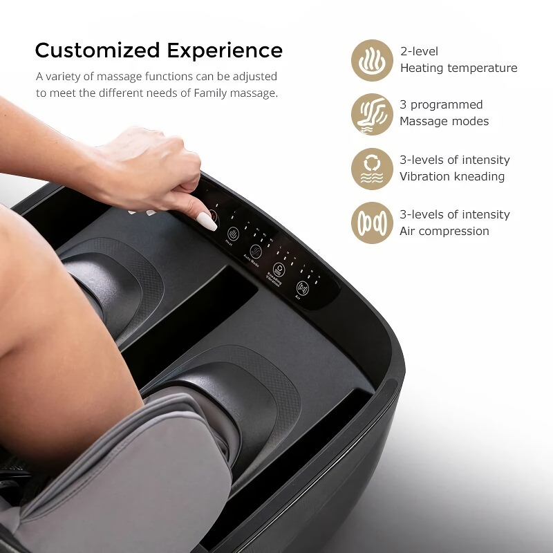 This product stands out with its foldable design, easily transforming from a high-end massager to a chic ottoman. Its easy-to-clean materials and adjustable support bar ensure a hygienic and comfortable experience that blends seamlessly into your home or office. Suitable for a wide range of foot sizes and with an auto shut-off feature, it’s safe, inclusive, and user-friendly.