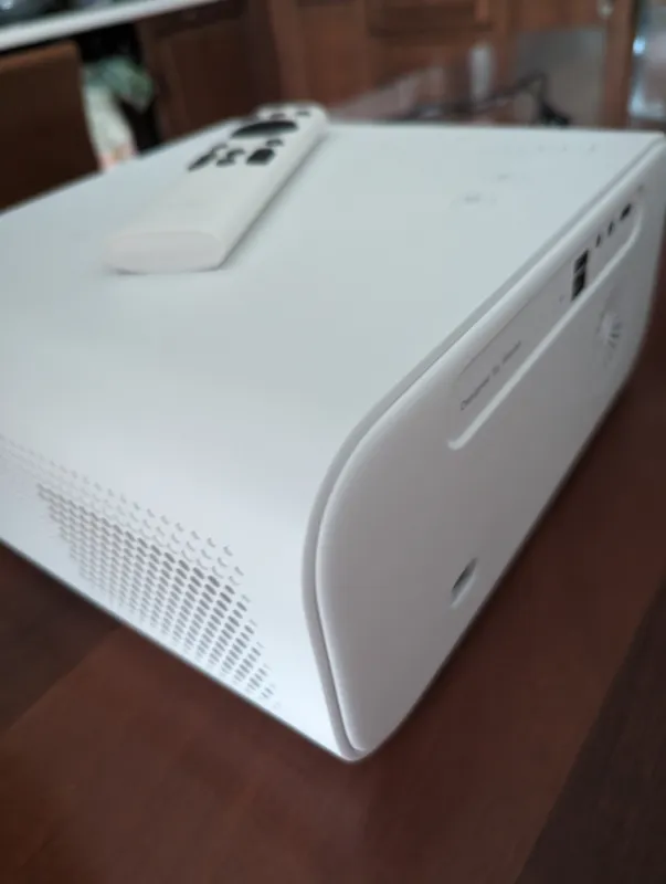 This is my inaugural experience with this particular brand, despite having previously used projectors from established names like Epson, BenQ, LG, among others. I must express that this product either matches or surpasses the performance of many models from those renowned brands. The build quality is exceptional, reflective of what one might anticipate from a subsidiary of Xiaomi. The projector itself boasts an aesthetically pleasing white body adorned with golden accents around the lens and front, complemented by ample vents on the sides for air circulation.