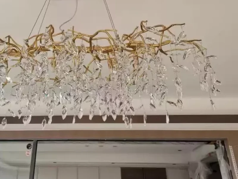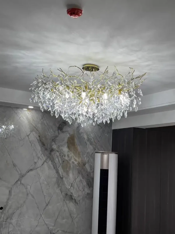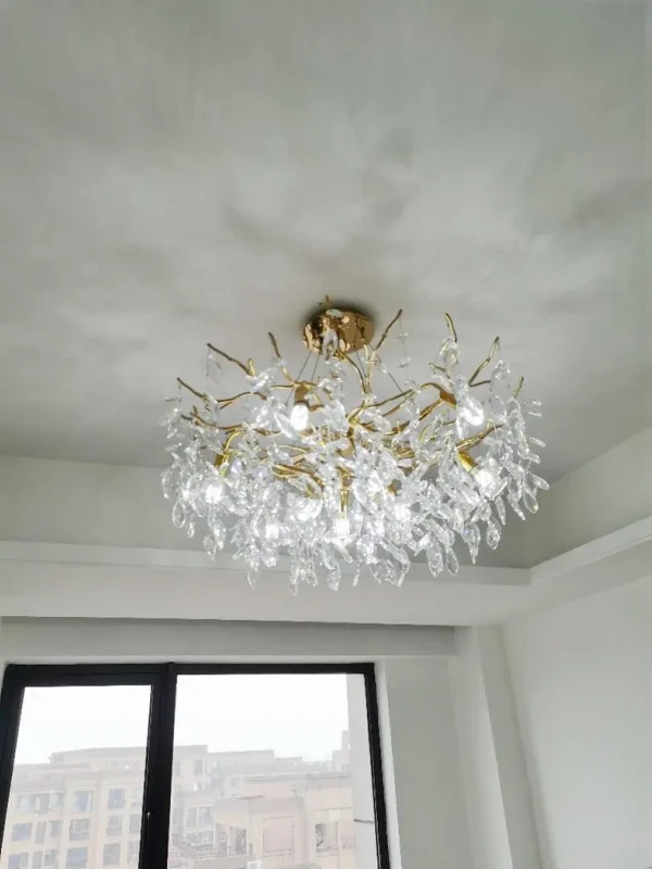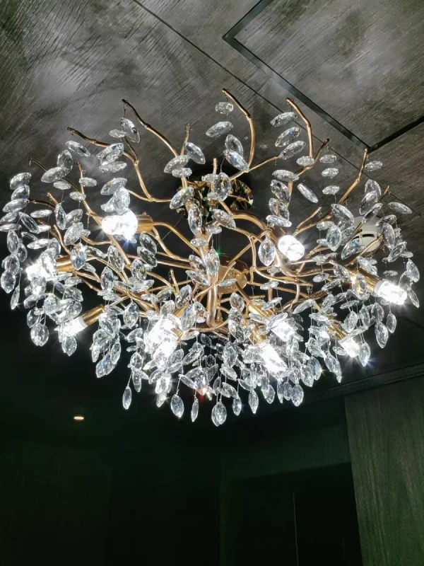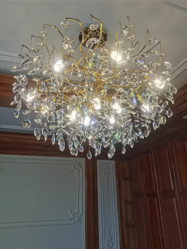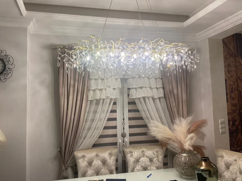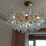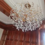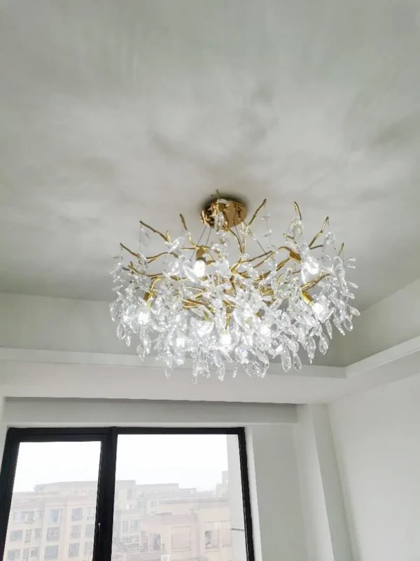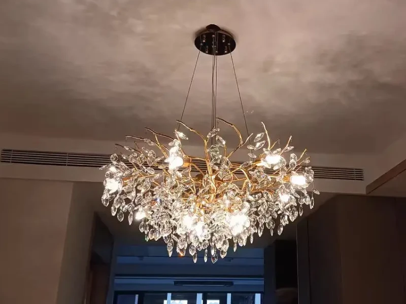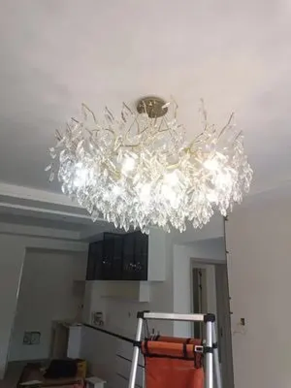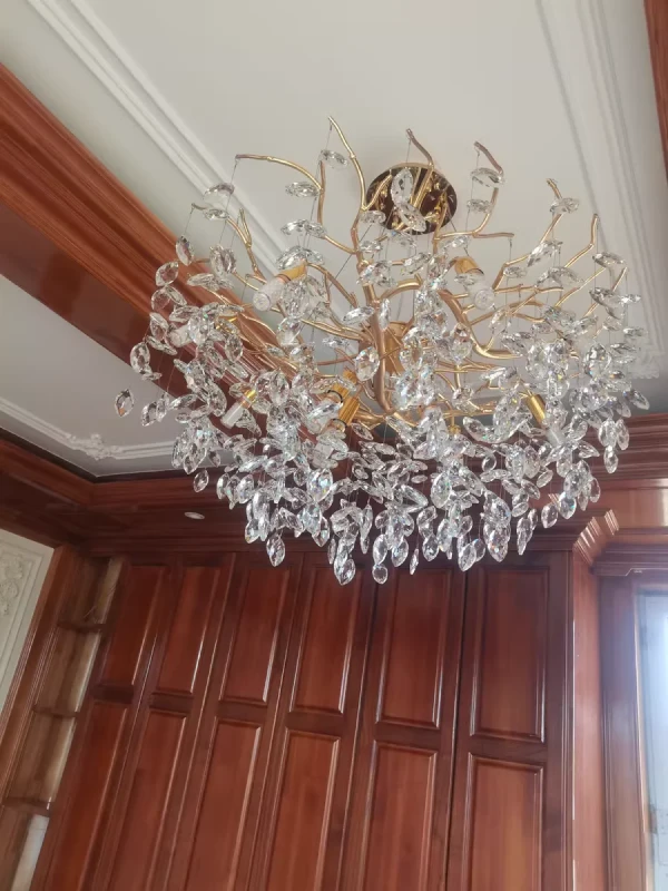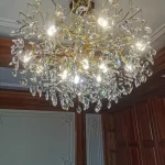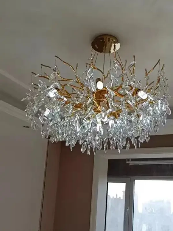 it’s a masterful blend of contemporary design and timeless elegance, encapsulated within a luxurious gold branch frame interwoven with sparkling crystals that seem to dance in the light. From its installation in my living room, the chandelier has not only transformed the space but has also become a beacon of sophistication and style that commands attention.