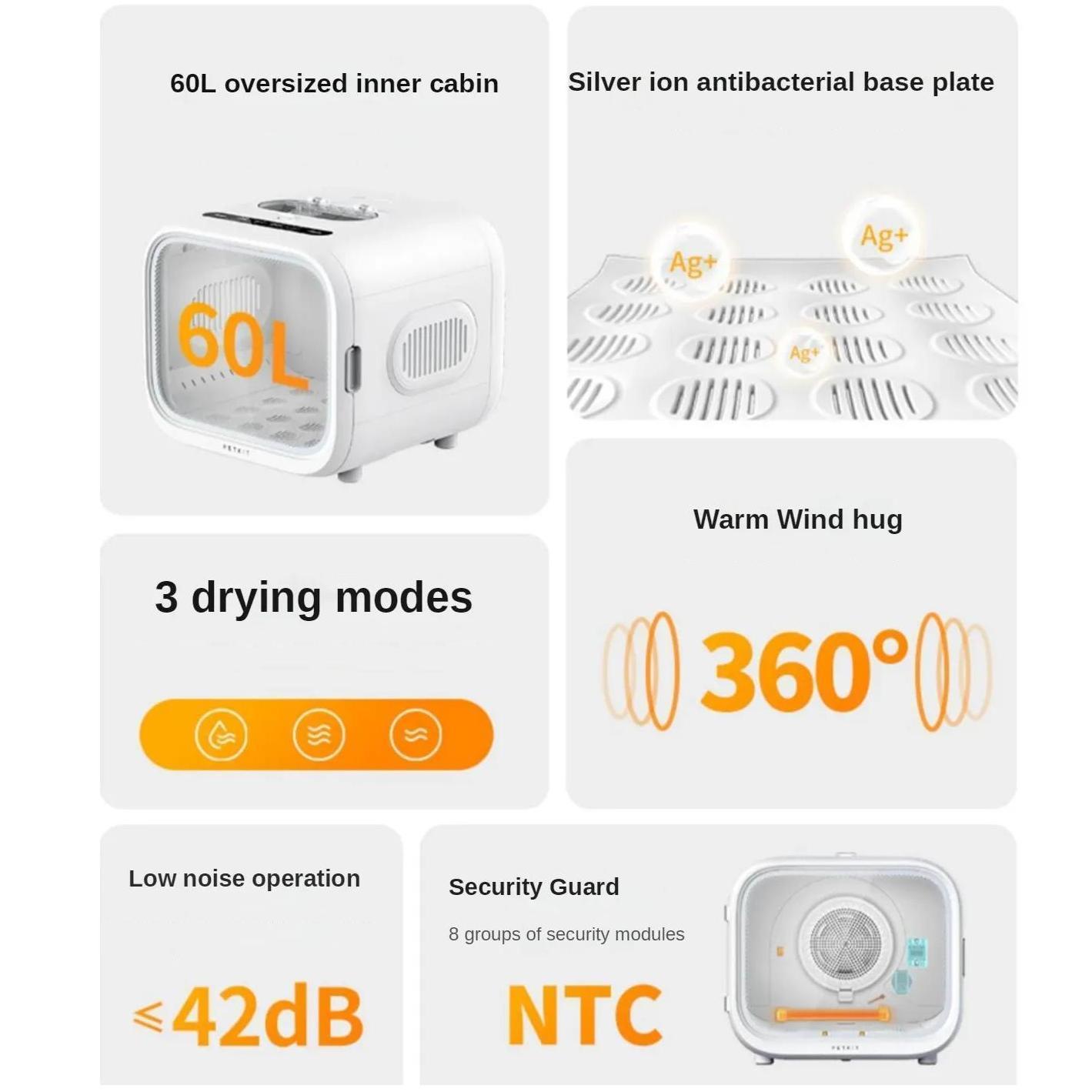 Introducing the ultimate solution to pet grooming woes: our Smart Pet Hair Drying Box. Designed to provide a comfortable, quick-dry experience for your furry friends, this innovative product is a must-have for pet owners. With its large 60L capacity and smart temperature control, grooming has never been easier or more efficient.