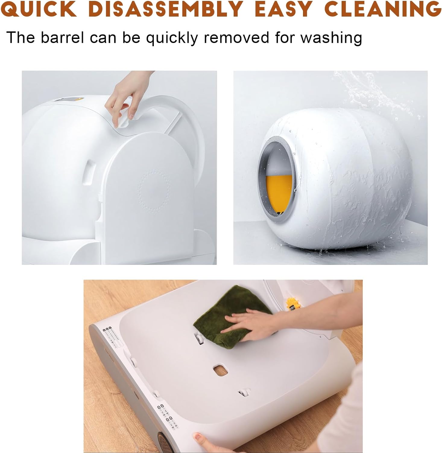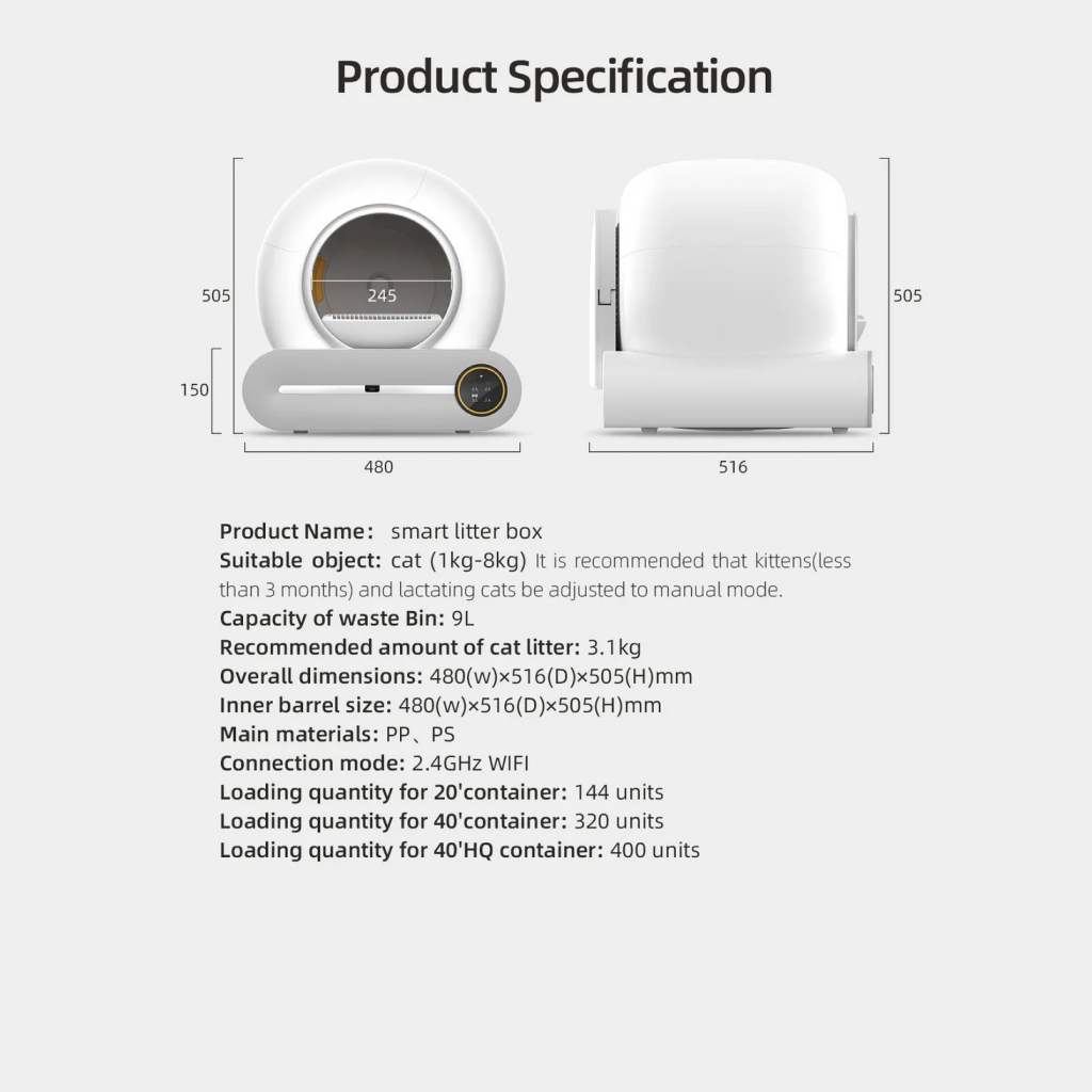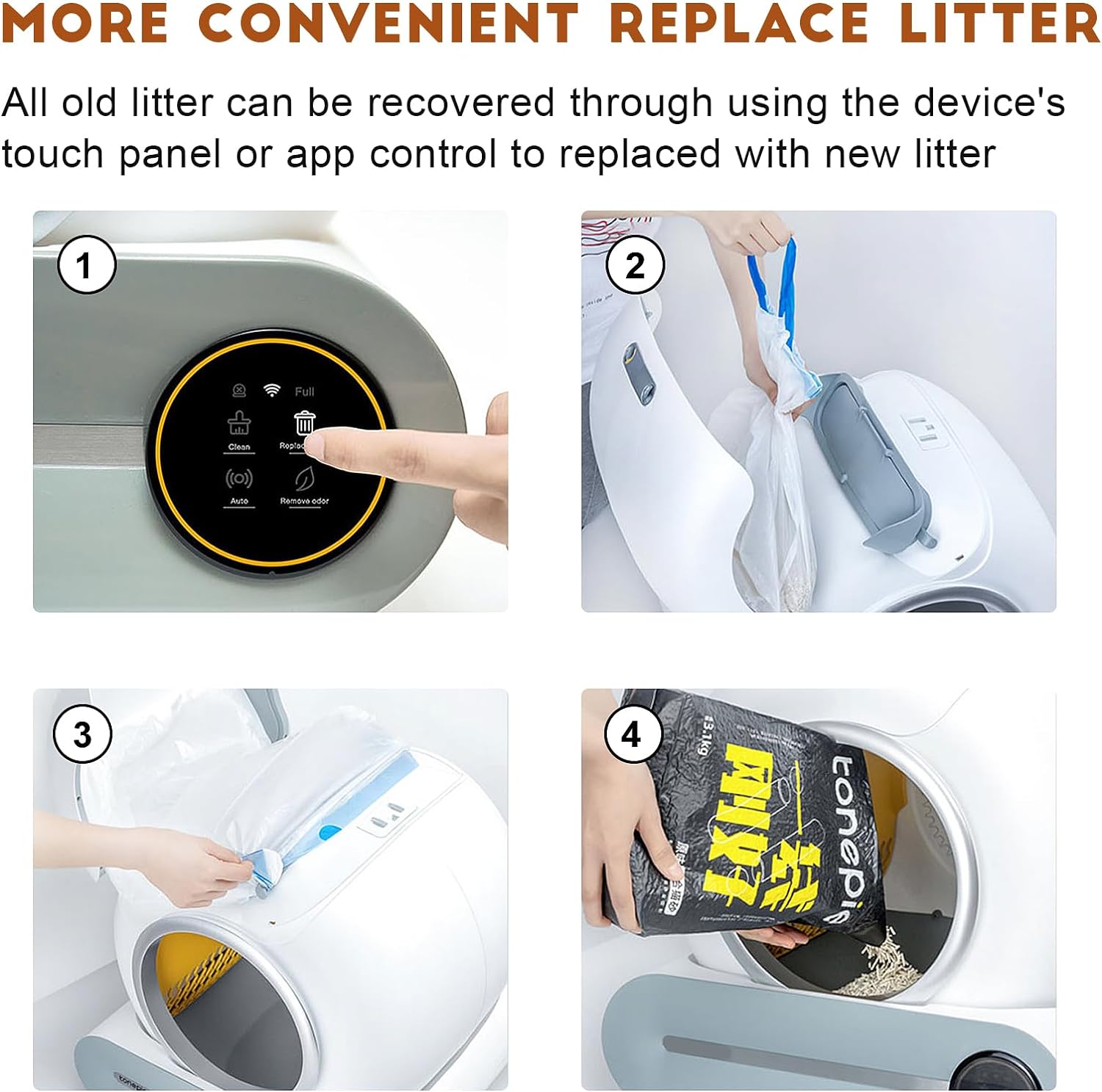 - App Control: Manage your litter box remotely with our user-friendly app, available in multiple languages. Receive updates on usage, fullness, and customize cleaning settings.