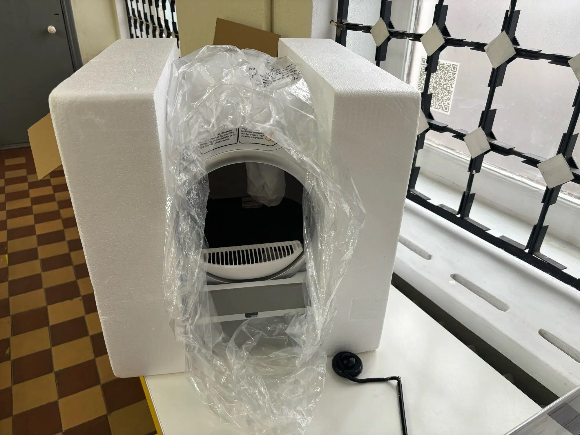Perfect packaging and works perfectly. You can scan a QR code that shows you a video explaining the montage and its use. It doesn’t make any noise and my cats immediately started using it. Zero odors. I am delighted with the purchase.