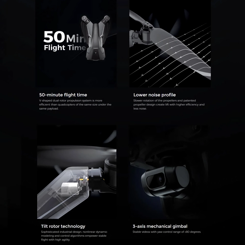 Whether you’re capturing breathtaking landscapes or following fast-paced action, the V-Coptr Falcon excels in every scenario. Its exceptional wind resistance and stable hovering capabilities ensure high-quality footage even in challenging conditions. The innovative bi-copter structure not only enhances flight time but also reduces noise, making it perfect for discreet operations.