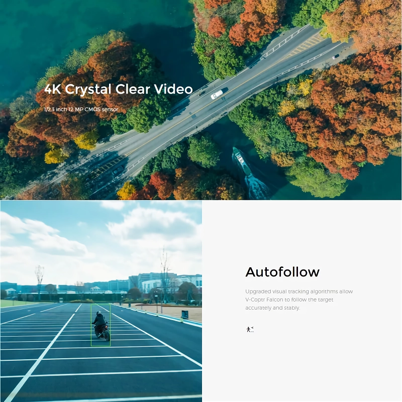 The V-Coptr Falcon’s camera is a true masterpiece. Equipped with a 1/2.3″ CMOS sensor and a wide-angle lens, it delivers crisp 12MP photos and 4K videos. The range of shooting modes, including single shot and self-timer, cater to all your creative needs. Plus, the 3-axis gimbal guarantees ultra-smooth footage, free from shakes and jitters.