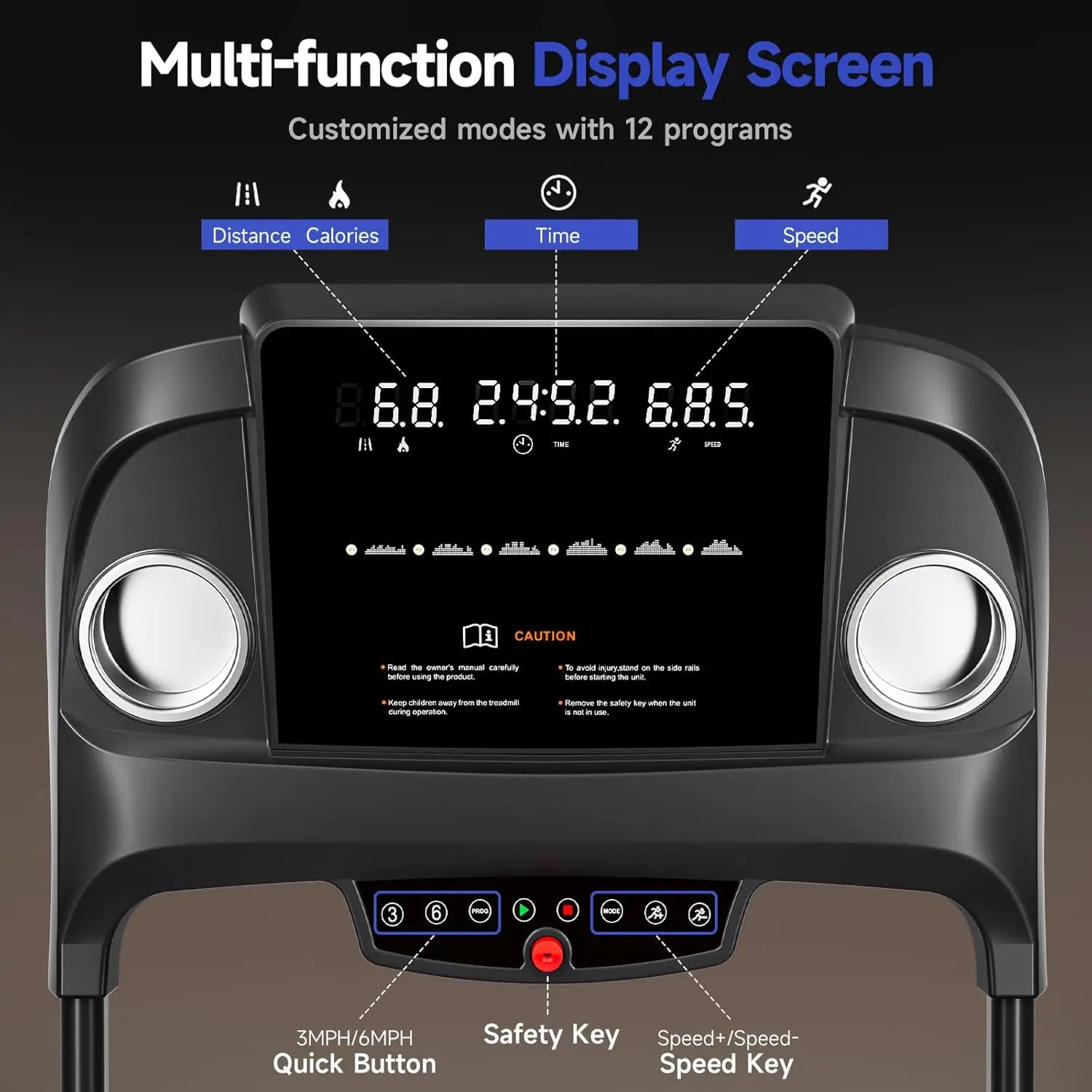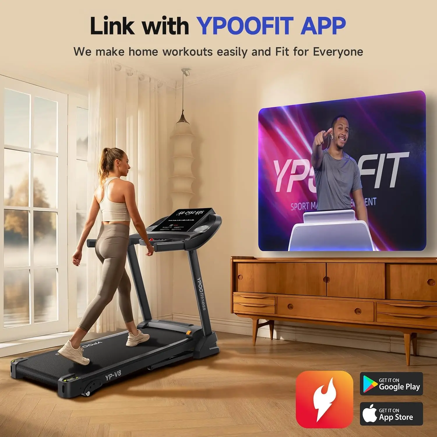 【CONNECTED TREADMILL FITNESS】Treadmill with your smart devices via Bluetooth and the YPOO APP. Built-in music playback allow you to enjoy your favorite music during fitness and view a variety of training events and live racing events on the APP. You can personalize your training and track your progress in real-time as you run. 【HUGE WINDOWN DISPLAY】The 16 Inch multi-function LED screen of folding treadmill clearly displays time, speed, distance and calories to accurately track your exercise performance. This treadmill with handles have P-button 12 preset programs and countdown modes provide different intensities of exercise and you can choose customized one with ease. 【AUTO FOLDING & COMPACT 】 Treadmill folds down smoothly and safely with a soft drop mechanism, allowing for hands-free folding. Treadmill also with wheels for easy moving,and store,When folded it has a total dimension of just 10.5 ft,suitable for use in small spaces.The running belt is equipped with a 5-layer non-slip belt. Reduce force rebound, buffer ground vibration,effectively reduce joint impact,protect the knee. 【Easy To INSTALLATION】 This treadmill has mostly of it’s assembled. only need to tighten 8 screws to assemble this walking pad treadmill. We are equipped with detailed installation tutorials, so there is no need to worry about installation issues. 【TREADMILL WITH INCLINE】Quick access to 3mph, 6mph, and the maximum of 8 mph. Discover the versatility of speeds. And offers a unique manual incline with a maximum incline of 8%,boosting calorie burn by up to 60% compared to a regular walking pad for home. Whether you’re a beginner or a seasoned runner, effortlessly select the perfect pace. 【Quality Awesome Service】YPOO is committed to providing every customer best possible experience and offers 24/7 support with satisfaction solutions.We provide users with high-quality after-sales service.